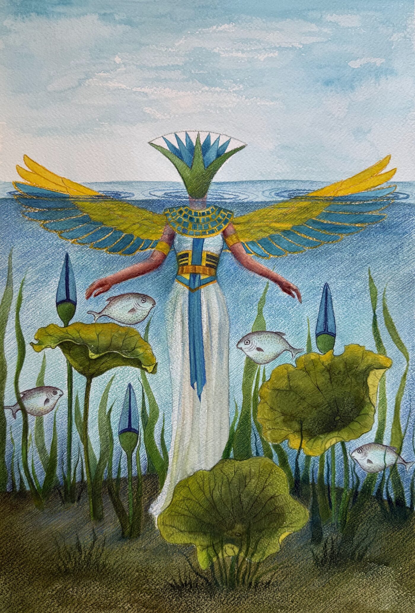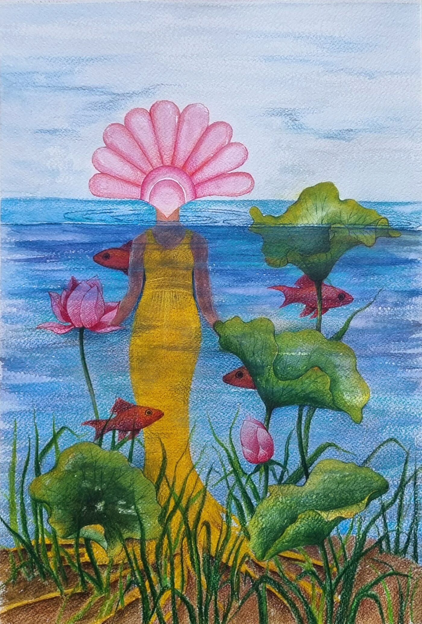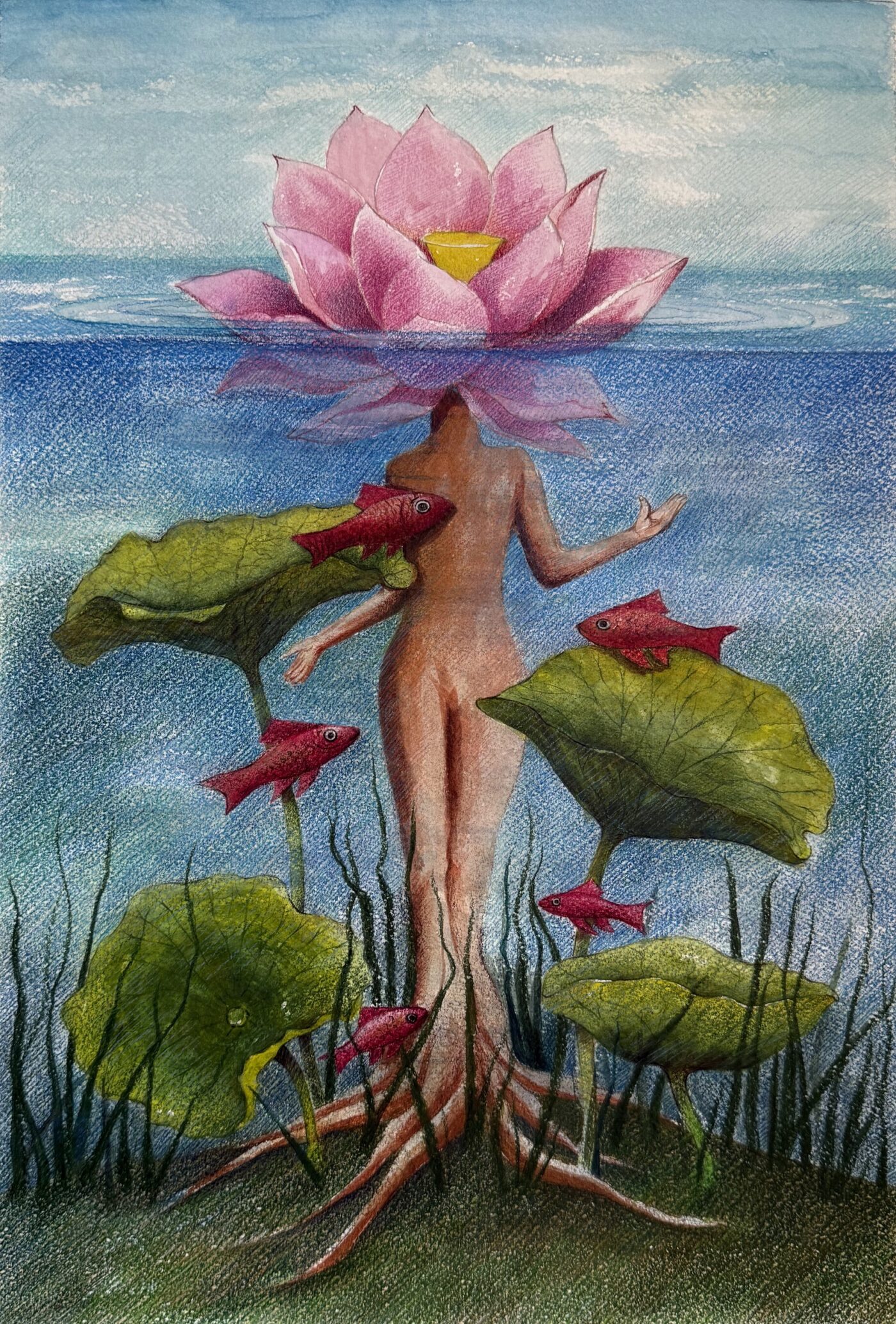 The theme of human creation and the subtle energies connected to human existence has always been at the core of my artistic exploration. In the course of my research, I unexpectedly encountered the lotus flower. As I delved into its symbolic and spiritual significance across various ancient civilizations, I found myself deeply drawn to it. Given my long standing fascination with mythology, the lotus emerged as more than just a visual element. It became a powerful emblem that opened new dimensions in my creative journey and deepened my understanding of the human connection with the sacred and the eternity.
