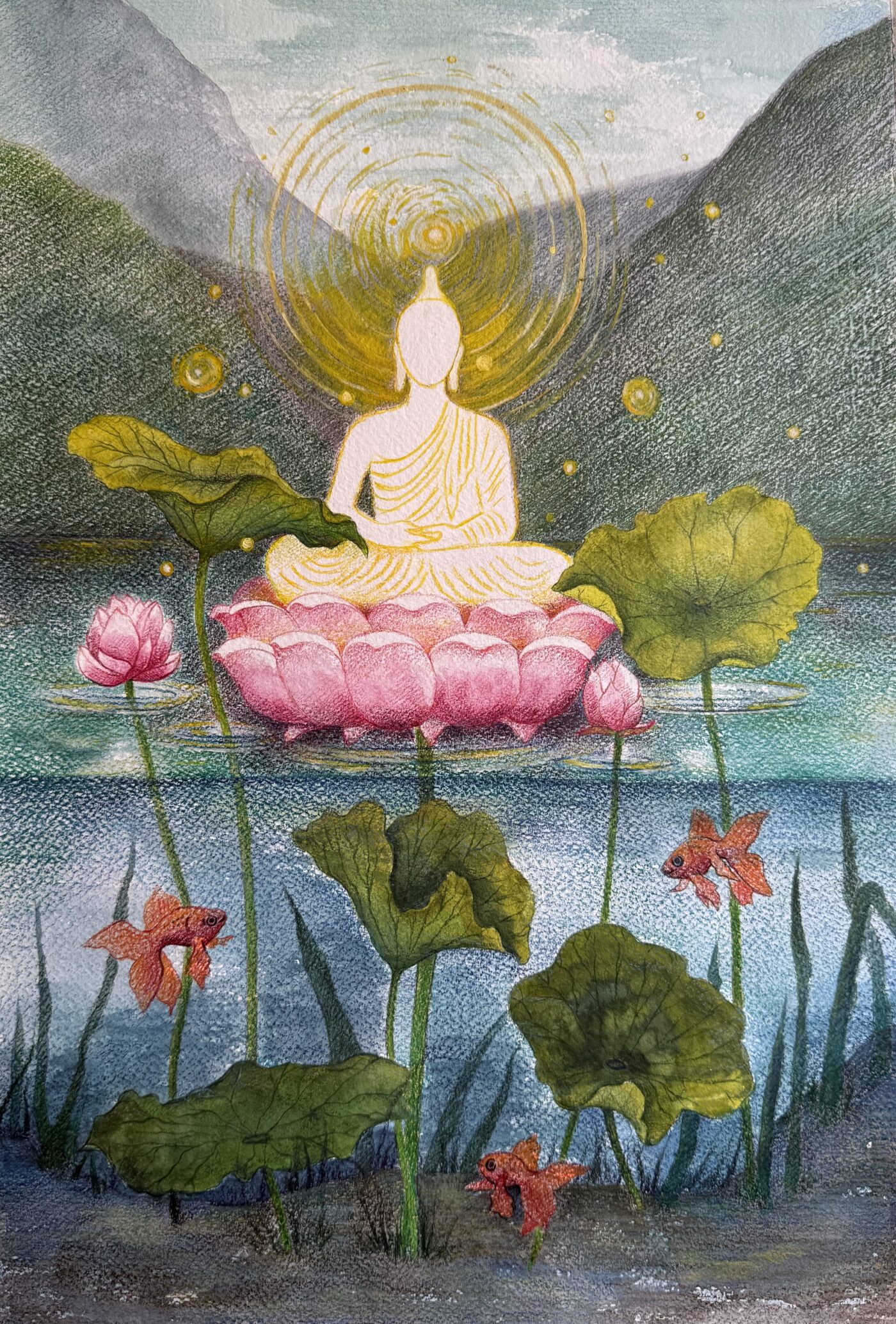 B U D D H AIn Buddhist mythology, the lotus flower represents purity, rebirth and the journey toward spiritual enlightenment. Although it grows in muddy water, the lotus remains clean and beautiful, reflecting the idea that one can rise above pain, desire and ignorance. Buddha is often depicted seated or standing on a fully bloomed lotus, symbolizing his spiritual awakening and detachment from worldly suffering. The stages of the lotus flower’s growth from bud to full bloom are also seen as a metaphor for the stages of a soul’s progress toward enlightenment.